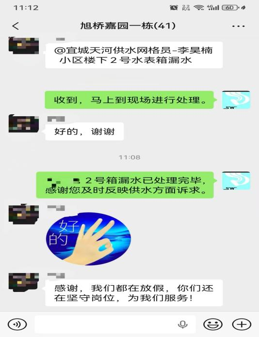 “感謝,我們都在放假,你們還堅守崗位,為我們服務!”10月5日11時08分,宜城市旭橋嘉園小區(qū)業(yè)主李女士在小區(qū)業(yè)主群里,向襄陽水務集團宜城天河供水有限公司網(wǎng)格員李昊楠發(fā)來感謝消息。而就在23分鐘前,她剛反映家中停水問題,現(xiàn)在水管故障已徹底解決,如此高效的服務響應讓業(yè)主倍感貼心。